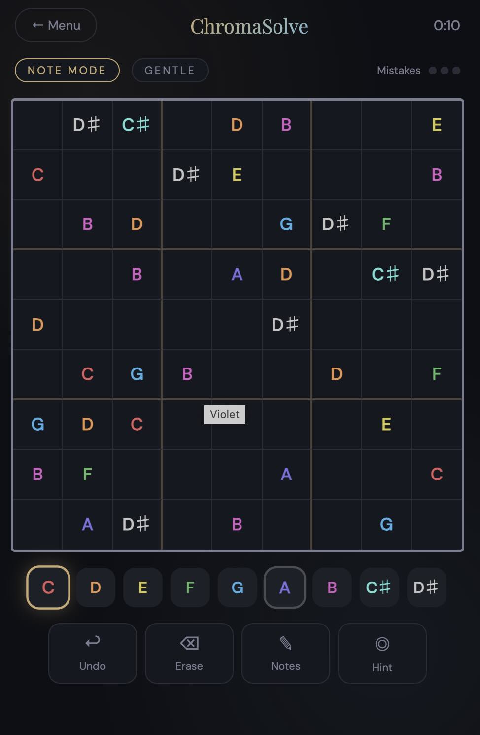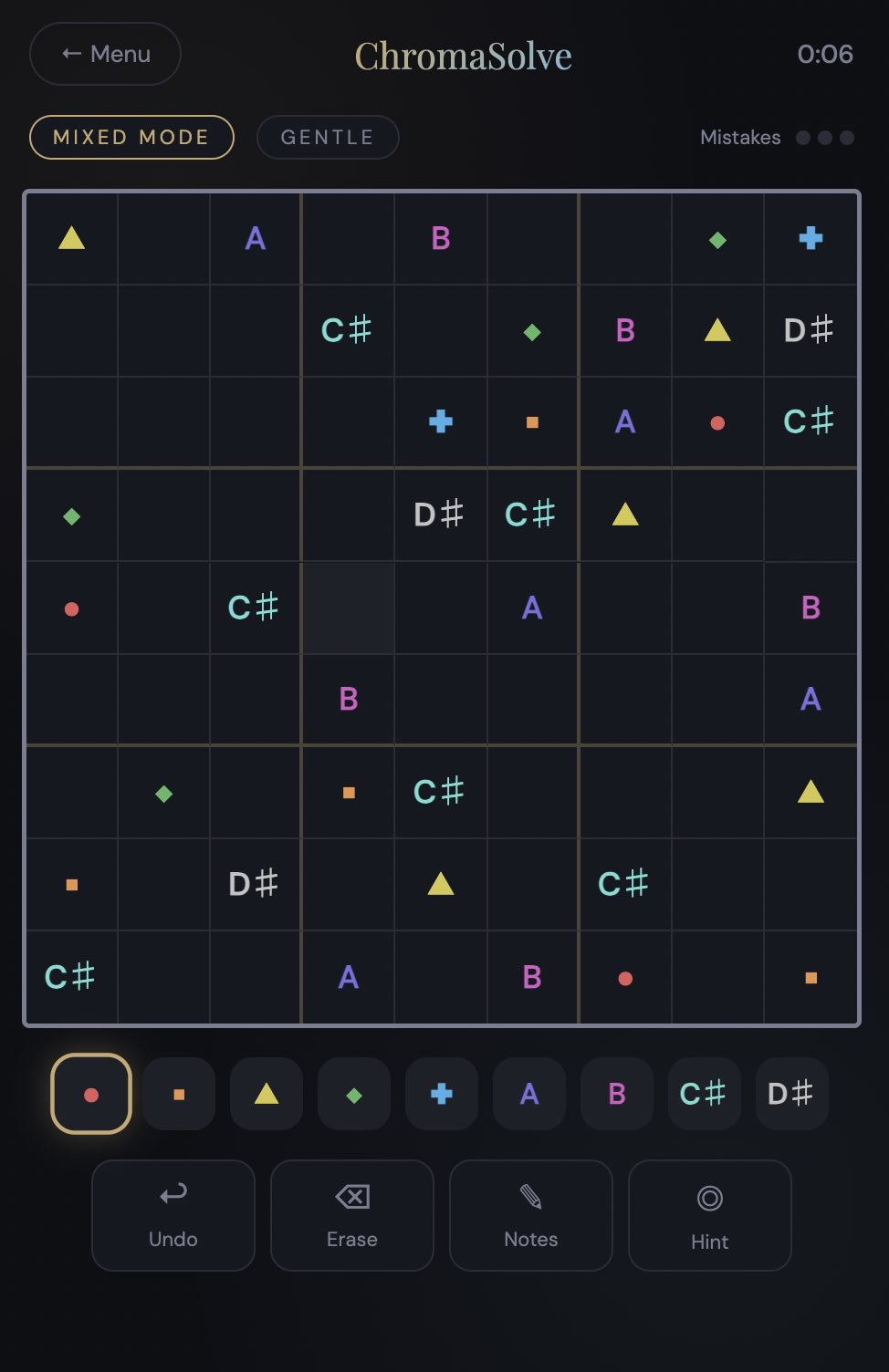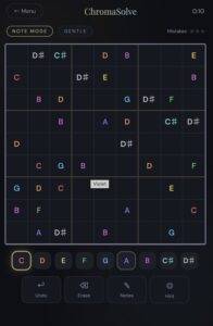 Note Mode The nine symbols become notes, C D E F G A B C# D#, and the app actually plays them when you place them. So, you’re kind of composing while you solve.
