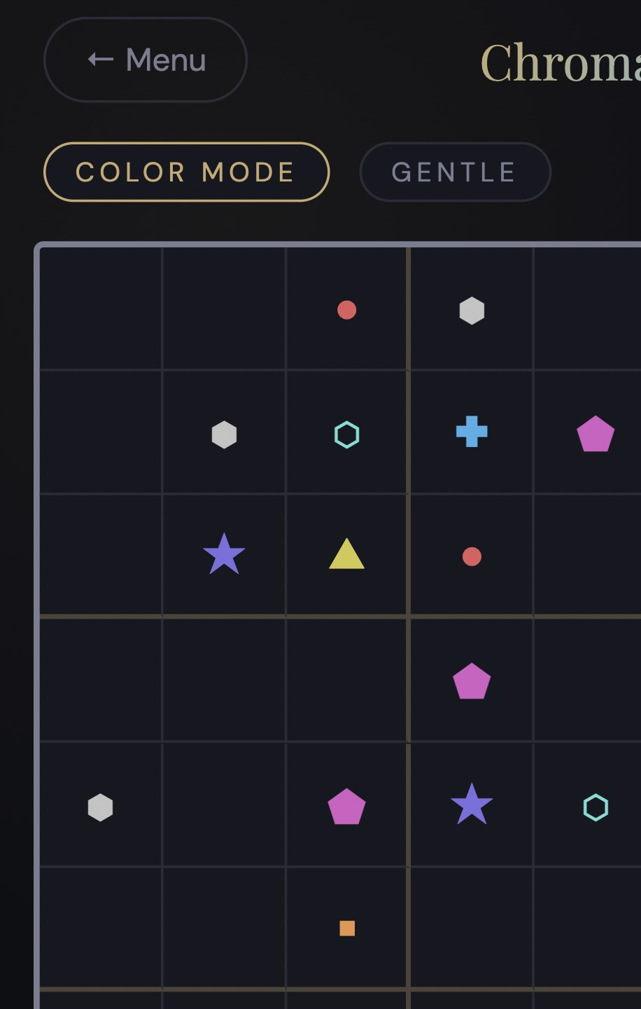 Pattern Mode is my answer. You turn it on and every color gets a unique shape too. Circle, square, triangle, diamond and so on. The colors don’t go away but now the shapes are doing the same job. You can ignore the color completely and just play on shapes. I put the toggle right on the title screen.